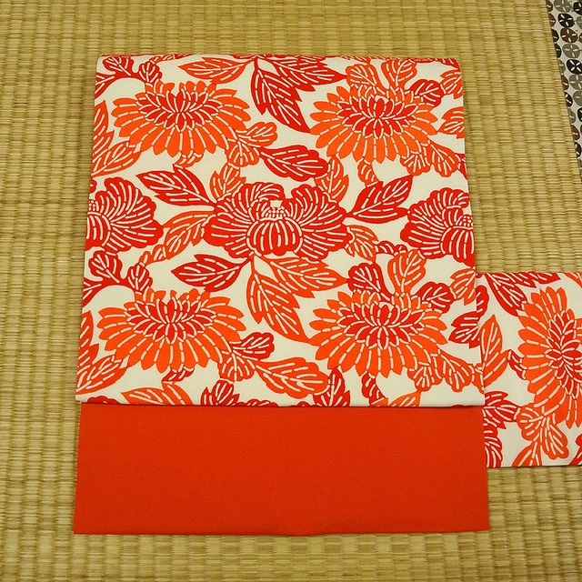 鮮やかな赤橙色に大柄の花の絞り 名古屋帯