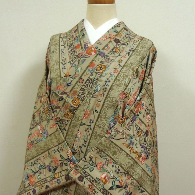 薄柳色の縦縞にぶどうや草花 小紋