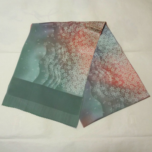 青緑、紫、ピンクのぼかしに波線の地紋と桜 帯揚げ