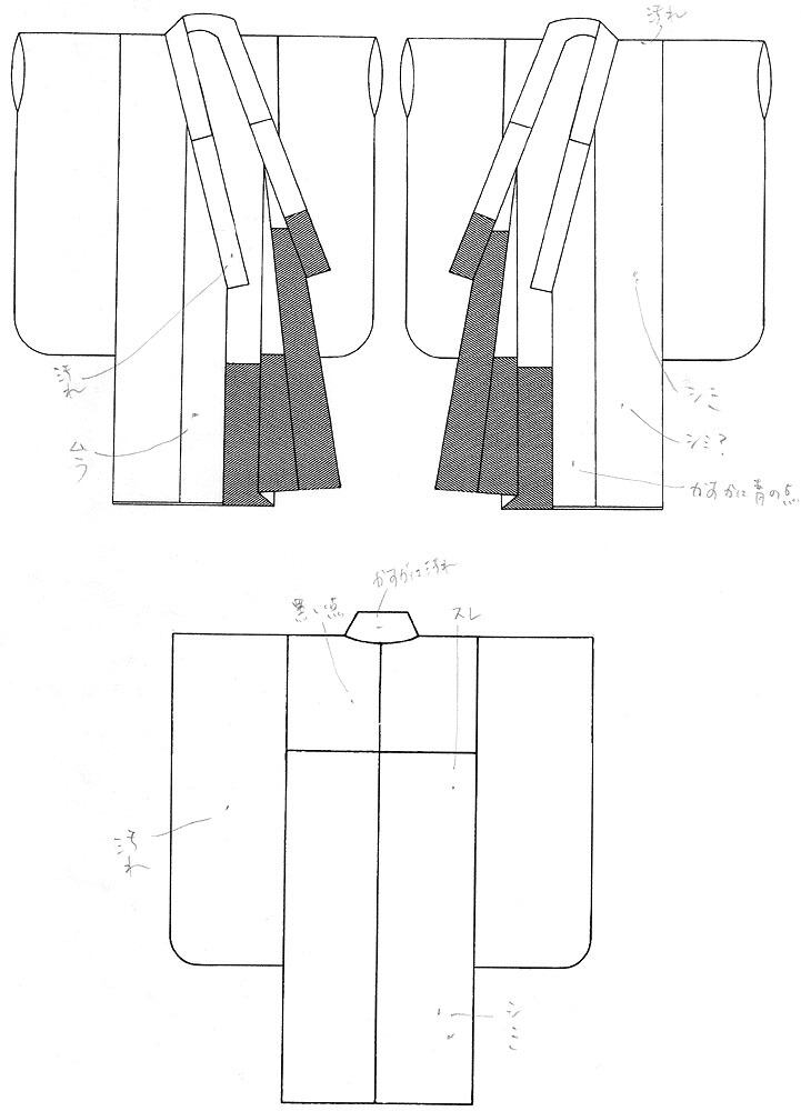 染料のにじみや飛びがところどころにあり、左裾にもあります。