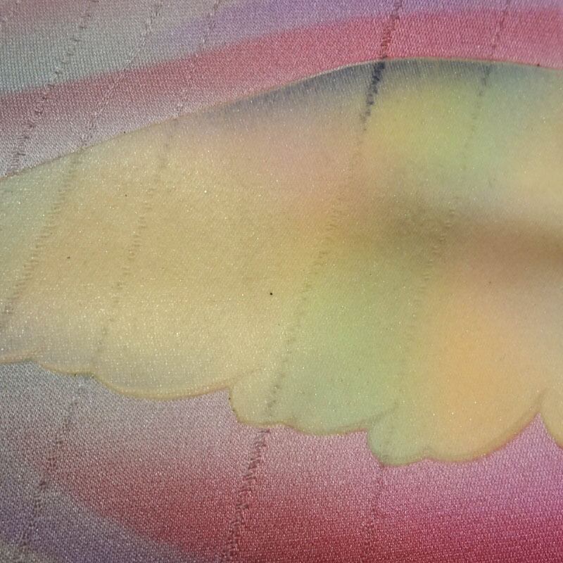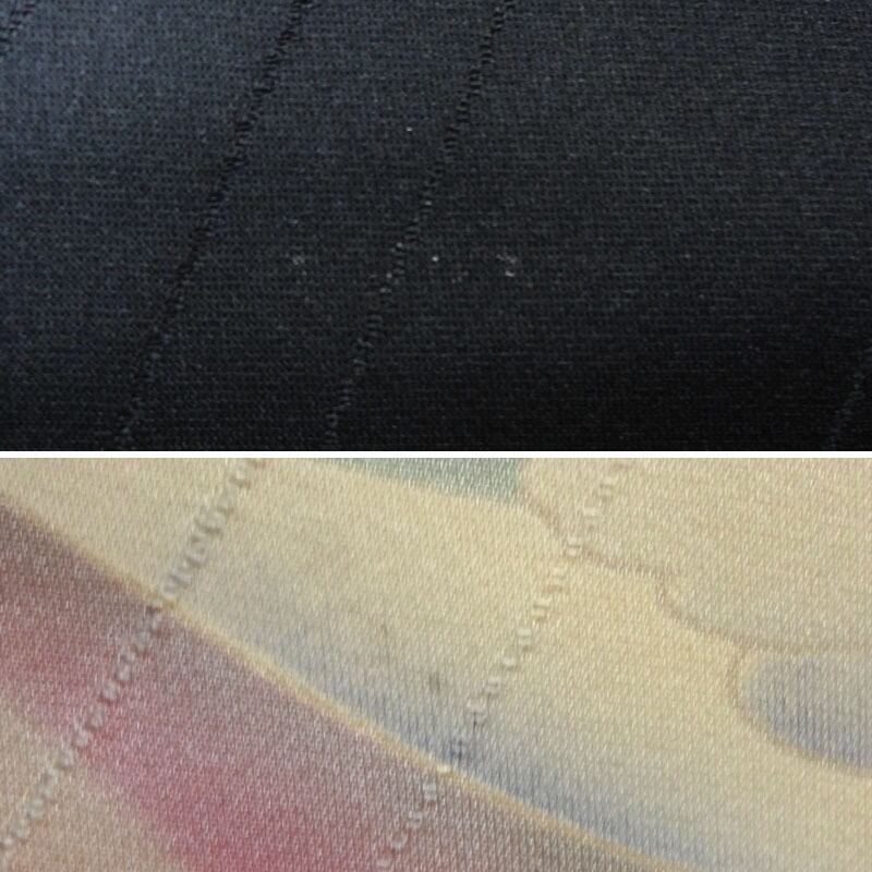 左裾の黄色の鳥に、黒い点々の付着と、スレがあります。
