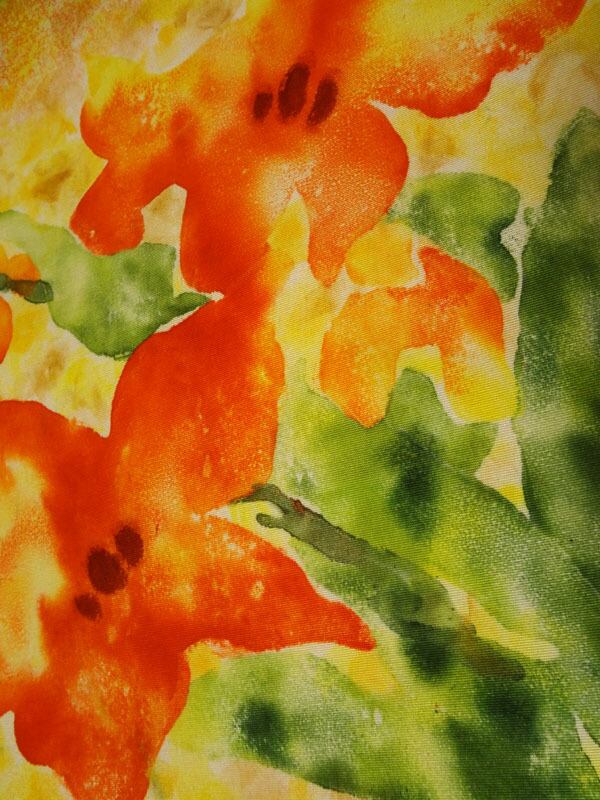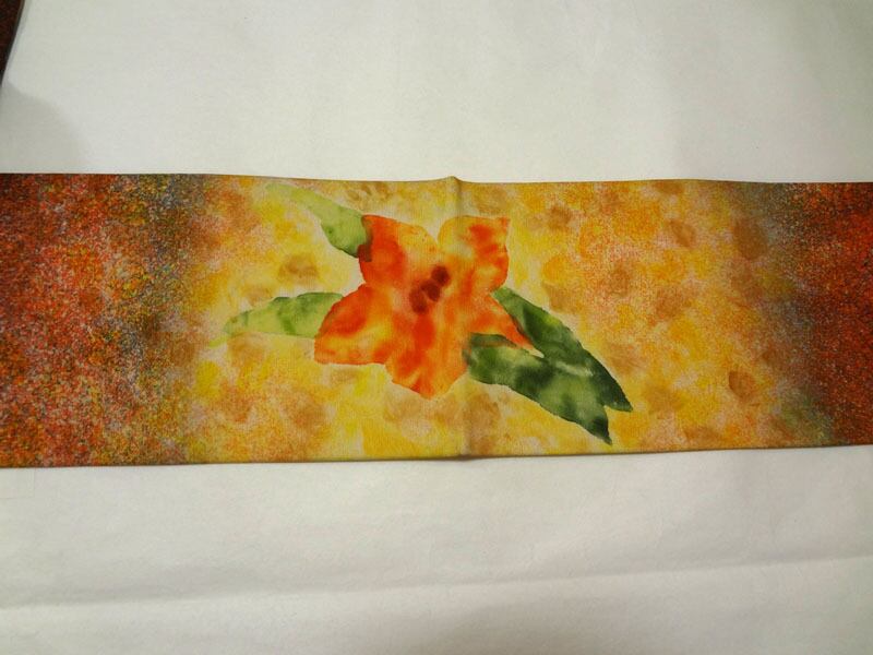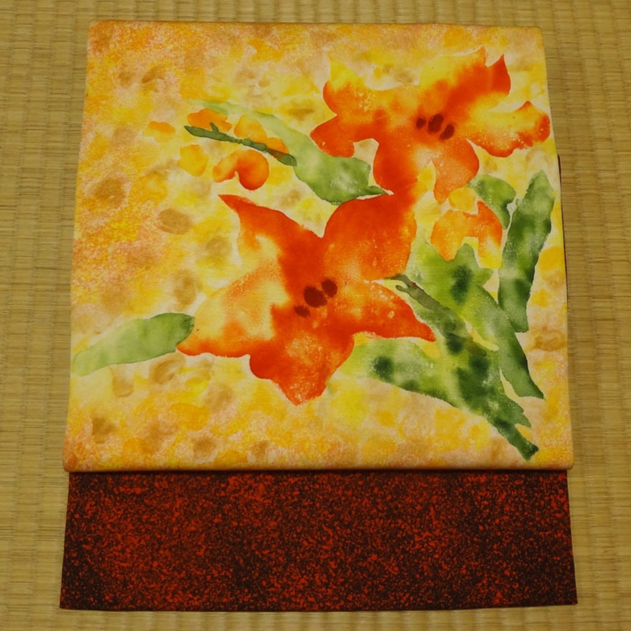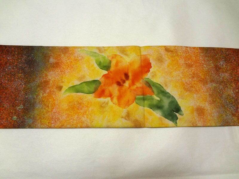 黒地に朱色の叩き染め調と大柄の花 名古屋帯