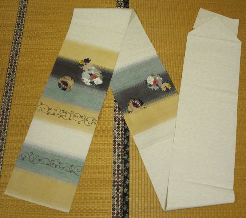 黄、黒、水色の縞に花と鞠の雪輪 八寸名古屋帯