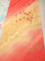 鮮やかなピンクのぼかしに葉や流水 帯揚げ