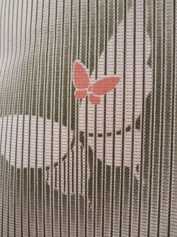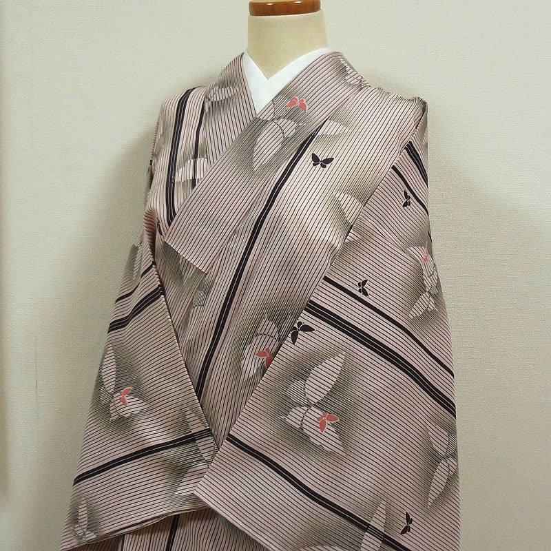 夏着物 薄いピンク色に縦縞と蝶 洗える小紋