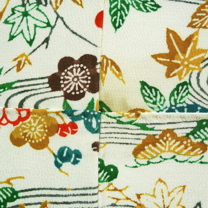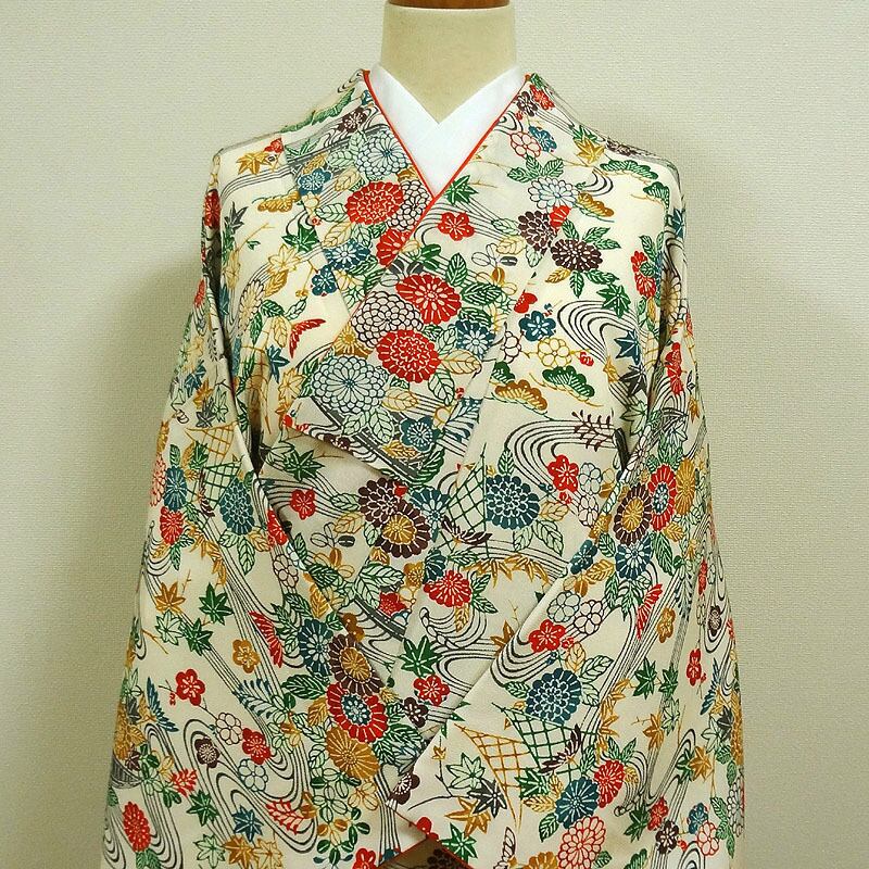 ほんのりクリーム色に紅型調の草花と流水 小紋