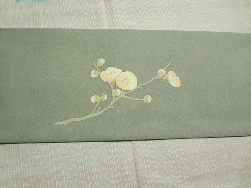 柳鼠色に梅と椿 名古屋帯