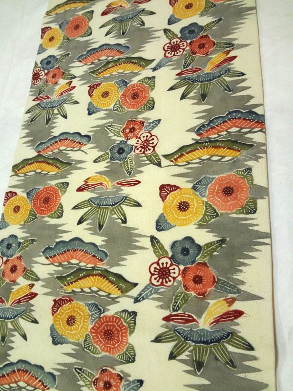 ほんのりクリーム色に紅型調 紬地調の名古屋帯