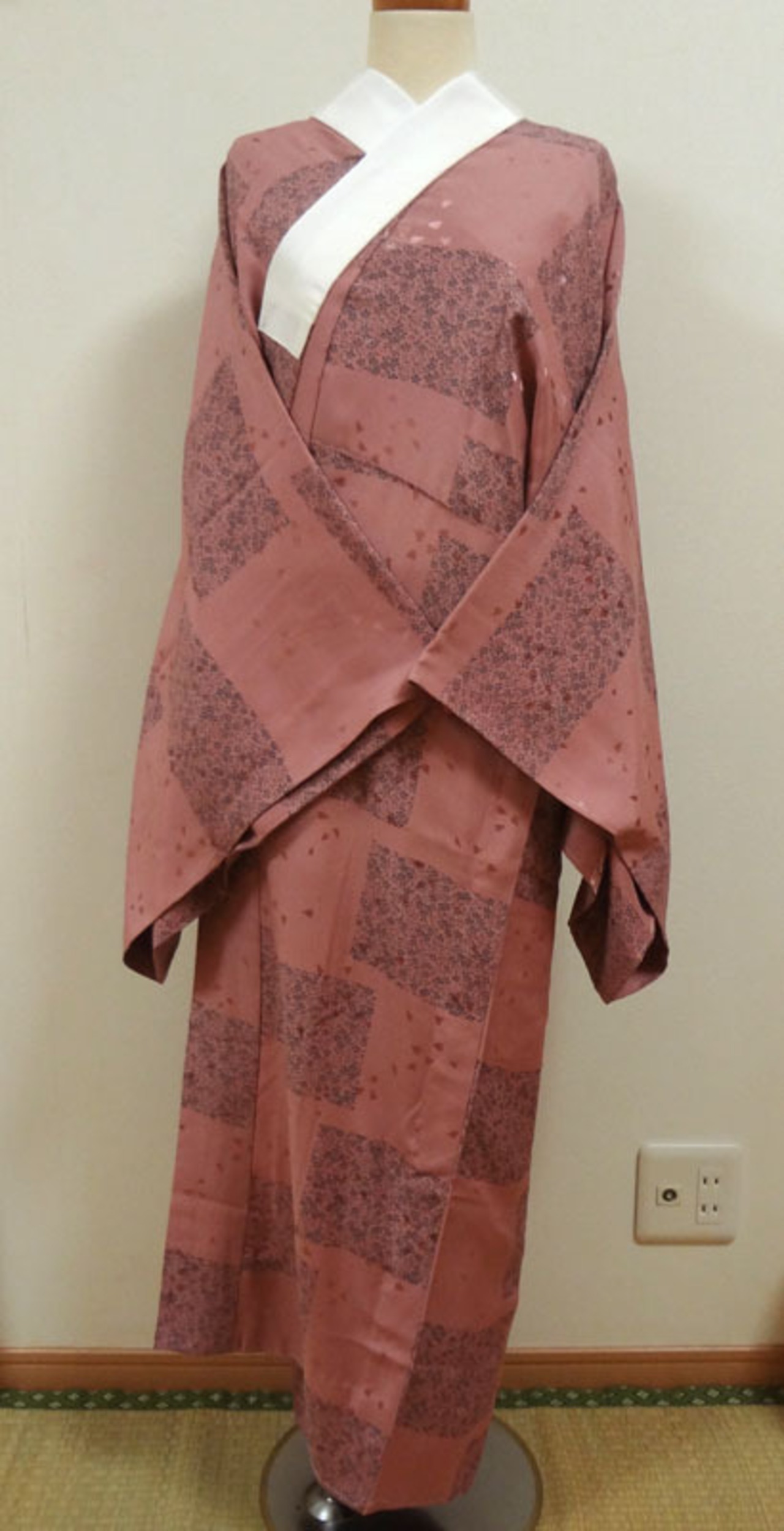浅蘇芳色の格子調に桜 長襦袢(胴抜き、袖無双)
